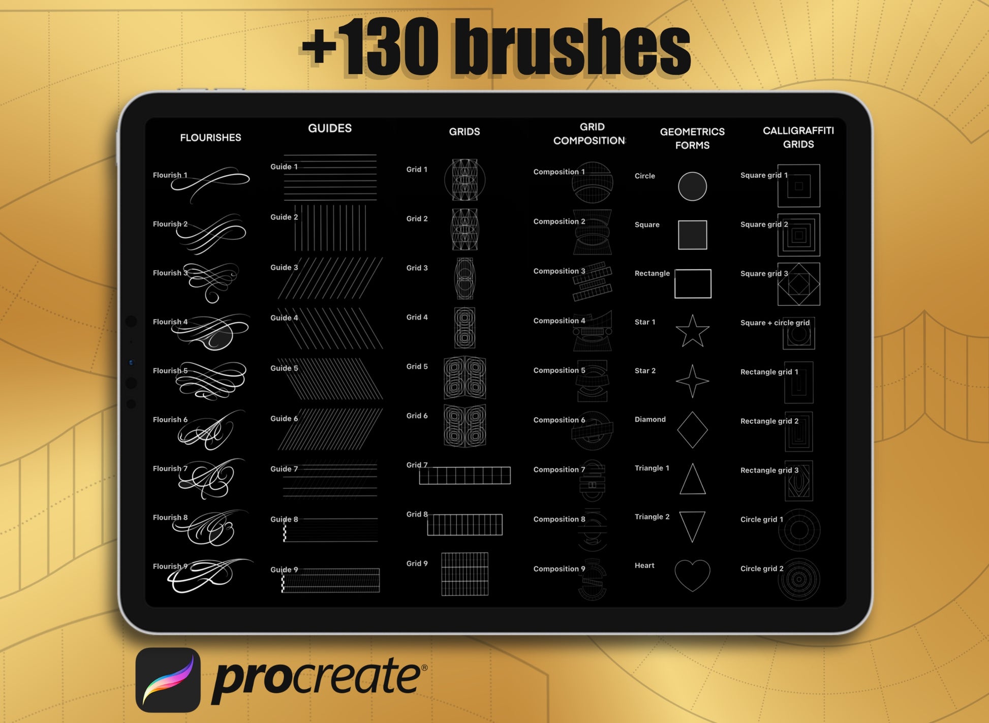 This pack includes over 130 grid and guide stamp brushes, designed to help you build professional, precise, and well-balanced lettering and calligraphy compositions. These tools allow you to structure your work with confidence, making it easier to design clean layouts, strong letterforms, and visually striking compositions from the very beginning.